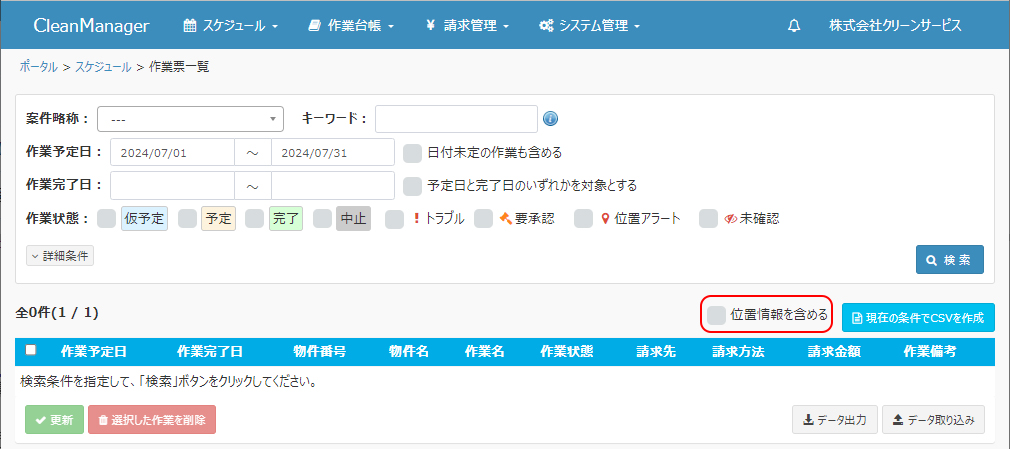 位置情報取得出力機能オプション有効時には、作業票一覧画面に「位置情報を含める」が追加されます。 本項目にチェックしてスケジュールのCSV出力を行うことで、作業開始・終了時の位置情報を含んだCSV ファイルを出力します。 ※スケジュールのCSV出力方法は「位置情報を含める」へのチェックを除き通常の手順と同様となります。→スケジュールのCSV出力 ※CSVファイルへ追加される項目は以下の通りとなります。