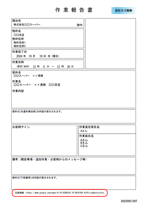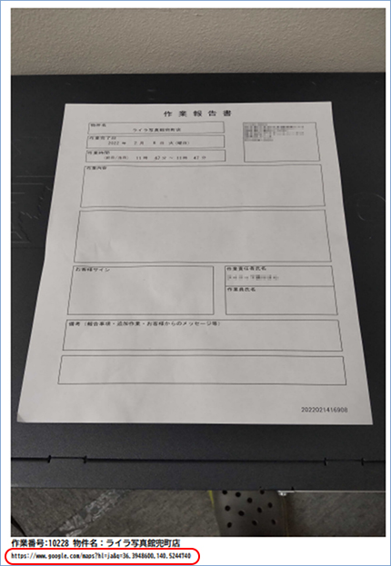 作業報告書への位置情報表示 位置情報取得出力機能オプション有効時には、作業報告書に作業完了時の位置情報が表示されます。 ※ブラウザやAdobe ReaderなどのURLをリンクとして認識可能な環境で報告書を開いた際には、位置情報のURLをクリックすると 当該位置情報がグーグルマップにて表示されます。 ※作業報告書の発行方法は作業報告書を発行するの手順をご参照ください。 |