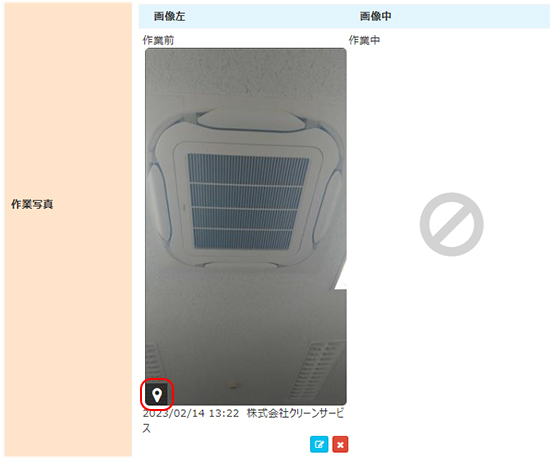 作業票に登録された写真の位置情報表示 位置情報取得出力機能オプション有効時には、作業票に登録された作業写真に撮影時の位置情報のリンク(アイコン)を表示します。 ※位置情報は撮影した写真毎に登録されます。 ※位置情報のリンク(アイコン)をクリックすると 当該位置情報がグーグルマップにて表示されます。 ※作業票の参照方法は作業票についての手順をご参照ください。 |