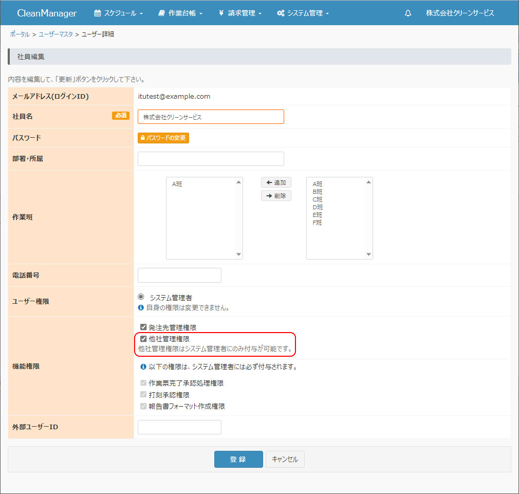 社外ユーザー管理機能オプション有効時には、ユーザーマスタにて自社ユーザーの新規登録・更新時に「機能権限」欄に「他社管理権限」が追加されます。 本項目にチェックすることで、当該ユーザーが社外ユーザー管理機能を利用できるようになります。 ※ユーザーマスタの新規登録・更新の手順につきましては以下のリンク先ページをご参照ください。(「他社管理権限」を除き通常の手順と同様となります。) →ユーザーマスタの新規登録 →ユーザーマスタの更新 |