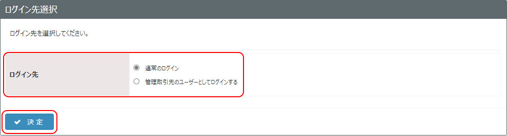 ②ログイン先を選択して「決定」ボタンをクリックすると、選択した取引先のユーザーとしてログインします。 | |