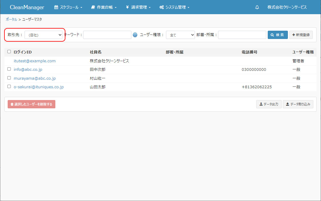 社外ユーザーの管理機能利用時の設定に基づき他社管理権限が有効になっているユーザーのログイン時には、ユーザーマスタ画面表示時に検索項目として「取引先」が追加されます。 「取引先」にて管理対象の取引先を選択して検索を行うと、選択した取引先に所属するユーザー(社外ユーザー)が表示され、ユーザーマスタの更新や削除を行うことができます。 ※社外ユーザーの検索方法は「取引先」の選択を除き通常の手順と同様となります。→ユーザーマスタの検索 ※社外ユーザーのユーザーマスタの更新方法は通常の手順と同様となります。→ユーザーマスタの更新 ただし、社外ユーザーのユーザーマスタの更新時には、ユーザー権限の変更を行うことはできません。ユーザー権限の変更が必要な場合には、社外ユーザー管理機能利用時のログインの手順にてその取引先のユーザーとしてログインして行ってください。 ※社外ユーザーの削除方法については通常の手順と同様となります。→ユーザーマスタの削除 ただし、社外ユーザーのユーザーマスタの削除時には、ユーザー権限が管理者ユーザーのユーザーは削除することができません。管理者ユーザーの削除が必要な場合には、社外ユーザー管理機能利用時のログインの手順にてその取引先のユーザーとしてログインして行ってください。 |