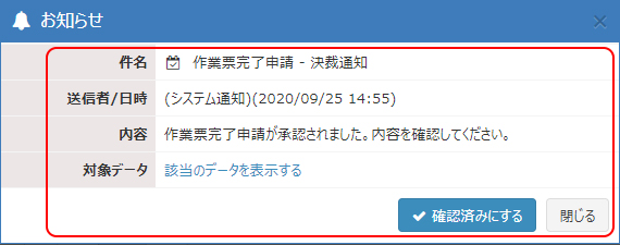 ユーザーに対して通知された未確認状態のお知らせを表示します。 ①ユーザーに対して通知された未確認状態のお知らせがあると、メニューのお知らせアイコン ![]() |
