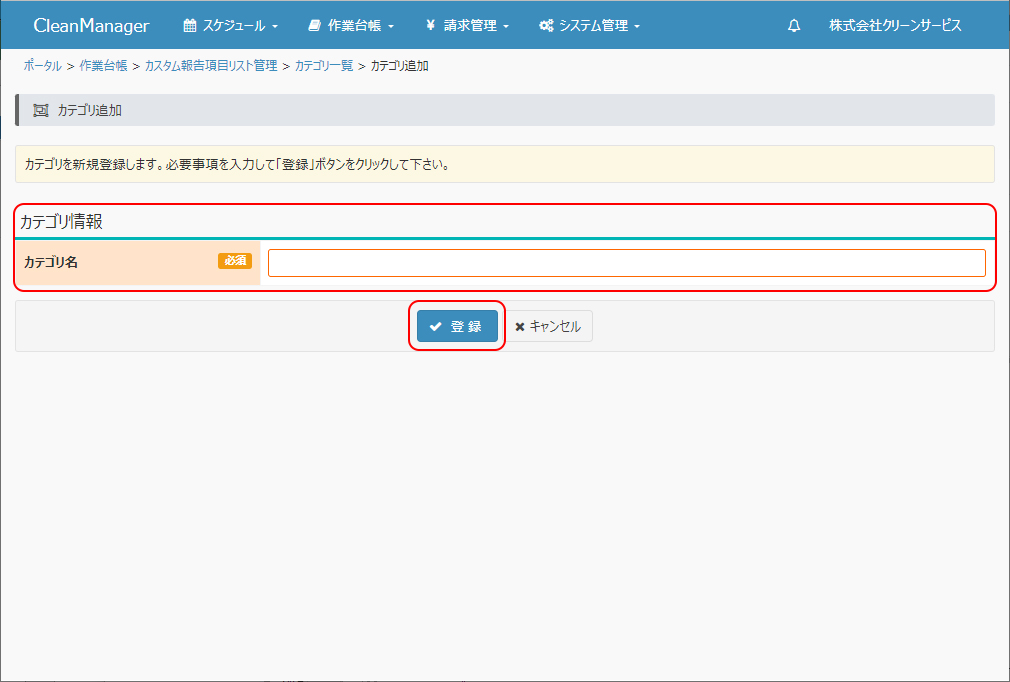 ③カテゴリ追加画面が表示されます。登録したいカテゴリ名を入力し、「登録」ボタンをクリックします。