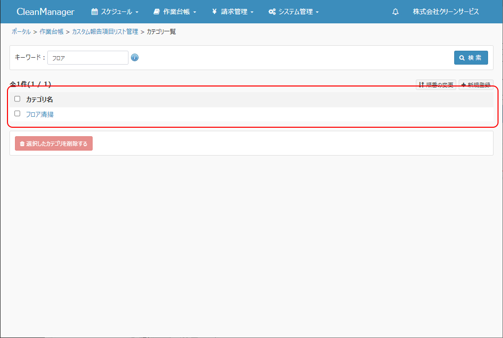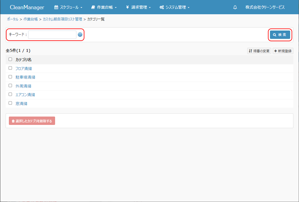 ②カテゴリ一覧画面が表示されます。「キーワード」に任意の文字列を入力し、「検索」ボタンをクリックします。