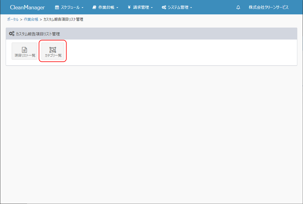 ①カスタム報告項目リスト管理画面にて「カテゴリ一覧」ボタンをクリックします。