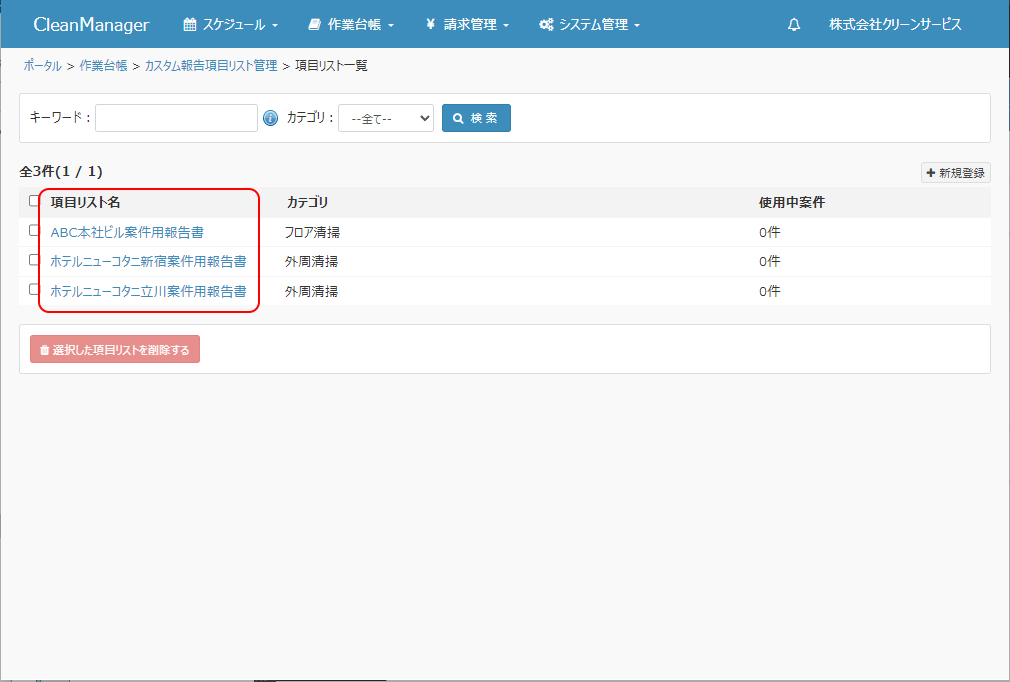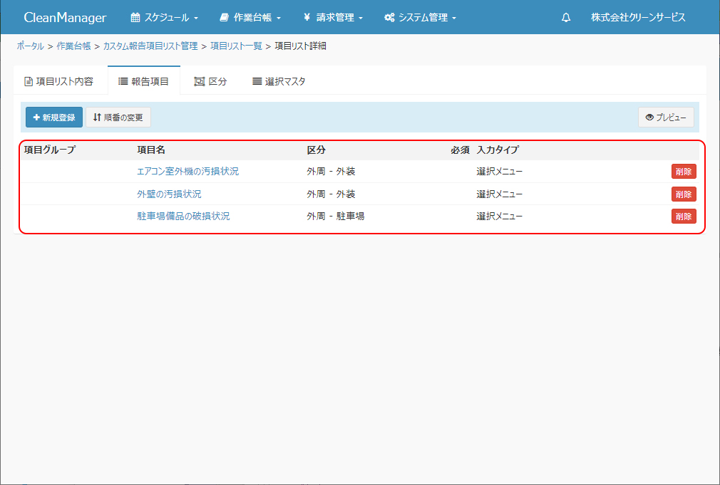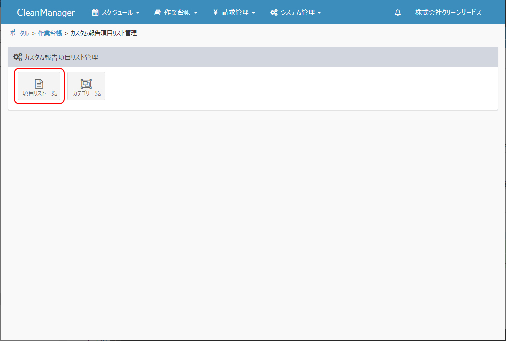 カスタム報告項目リスト詳細画面内に表示される登録済み報告項目、区分、選択マスタの並び順を変更します。 ①カスタム報告項目リスト管理画面にて「項目リスト一覧」ボタンをクリックします。 |