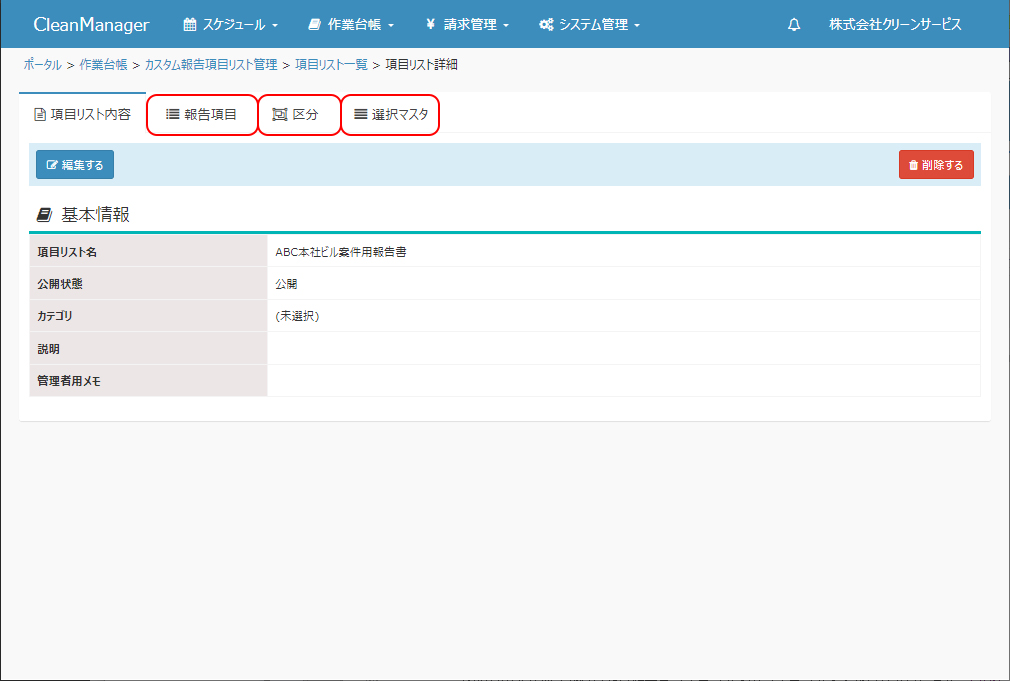 ③「報告項目」、「区分」、「選択マスタ」のうち、項目の並べ替えを行いたい項目のタブをクリックします。 | |