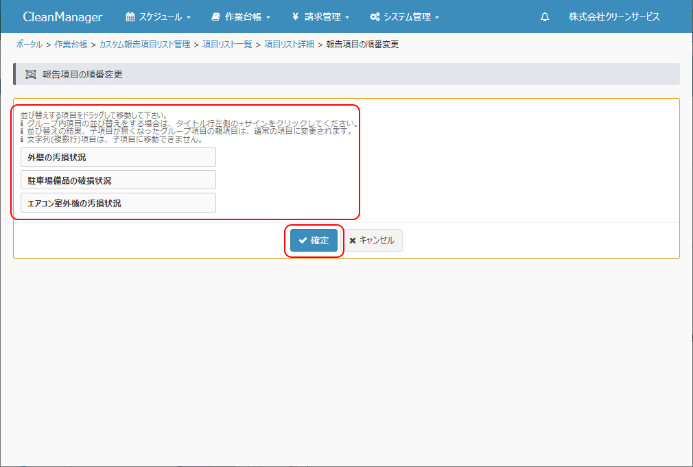 ⑤ ③で選択した項目に対応した順番変更画面が表示されます。並べ替えたい項目を任意の位置へドラッグして「確定」ボタンをクリックします。 ※報告項目、ならびに区分の順番変更時にグループ内項目の並び替えをする場合は、タイトル行左側の+サインをクリックしてください。 ※報告項目の順番変更時に、並び替えの結果子項目が無くなったグループ項目の親項目は、通常の項目に変更されます。 ※報告項目の順番変更時に、文字列(複数行)項目は子項目に移動できません。 |