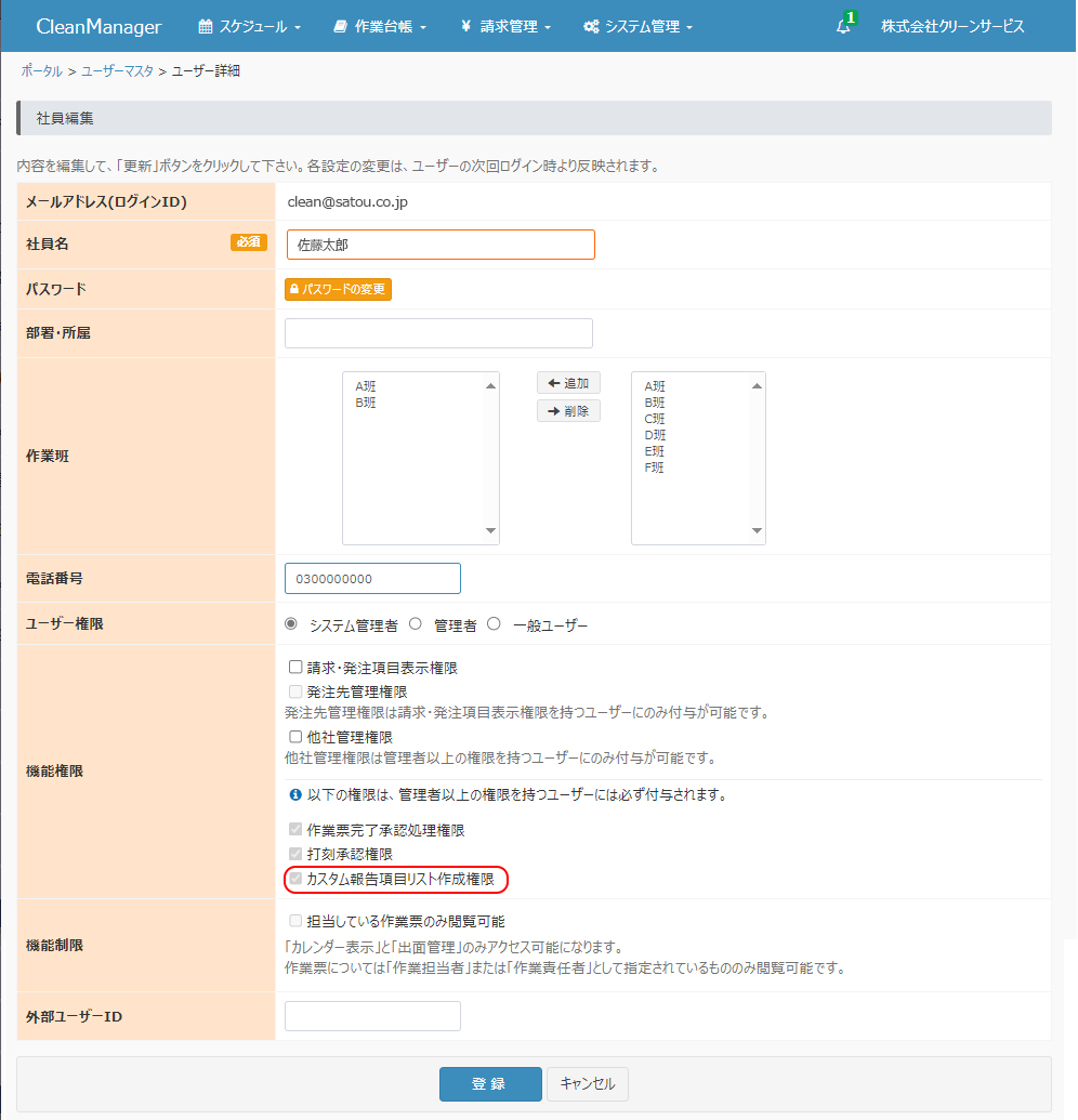 カスタム報告項目リスト管理機能オプション有効時には、ユーザーマスタにて自社ユーザーの新規登録・更新時に「機能権限」欄に「カスタム報告項目リスト作成権限」が追加されます。 システム管理者・管理者の権限を持つユーザーの場合、本項目には必ずチェックが入り、当該ユーザーはカスタム報告項目リスト管理機能を利用できます。 一般ユーザーの場合、本項目にはチェックを入れることができず、当該ユーザーはカスタム報告項目リスト管理機能を利用できません。 ※ユーザーマスタの新規登録・更新の手順につきましては以下のリンク先ページをご参照ください。(「カスタム報告項目リスト作成権限」を除き通常の手順と同様となります。)→ユーザーマスタの新規登録 →ユーザーマスタの更新 |