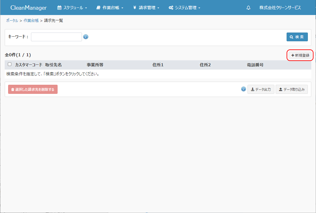 ①請求先一覧画面にて「新規登録」ボタンをクリックします。 |