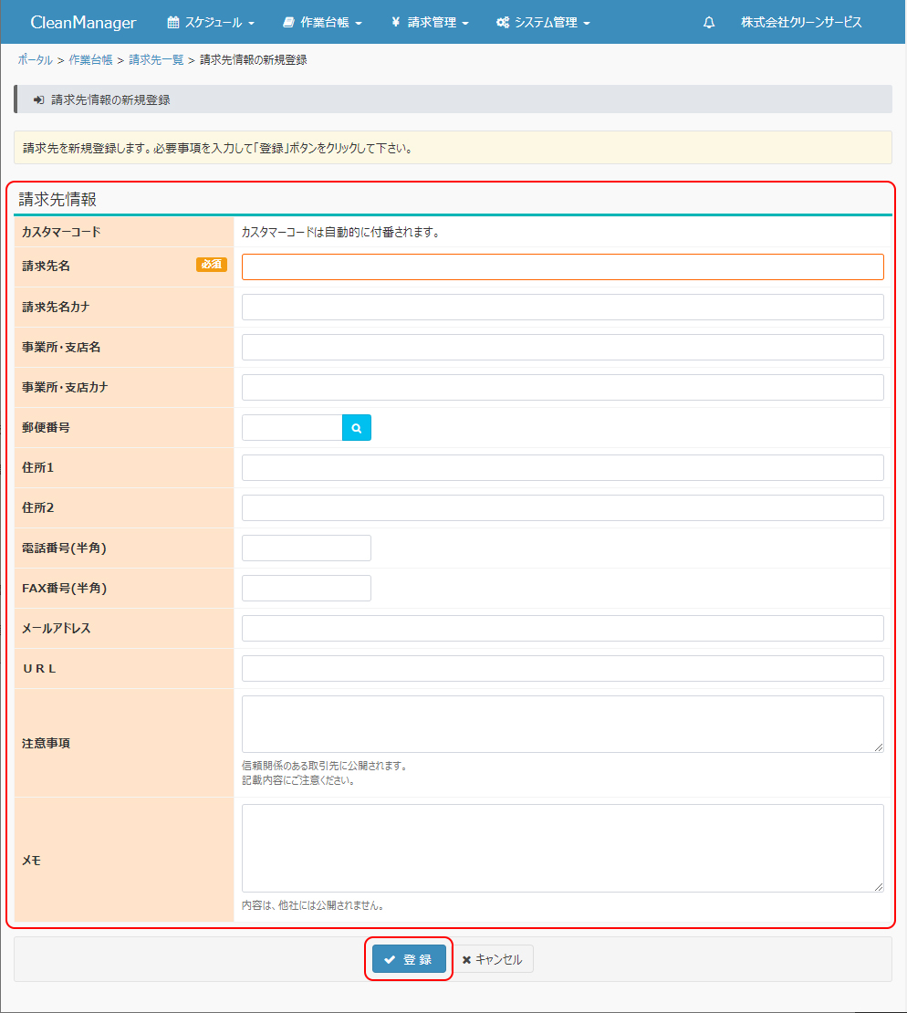カスタマーコード:請求先に対してカスタマーコードが自動付番されます。(入力の必要はありません。)