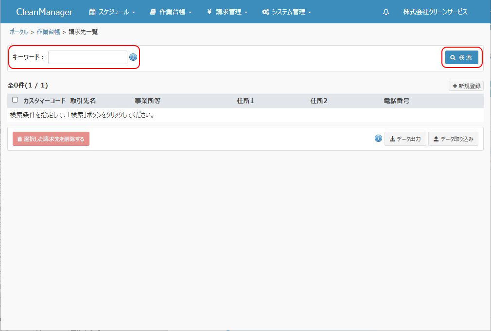 ①請求先一覧画面にて「キーワード」に任意の文字列を入力し、「検索」ボタンをクリックします。