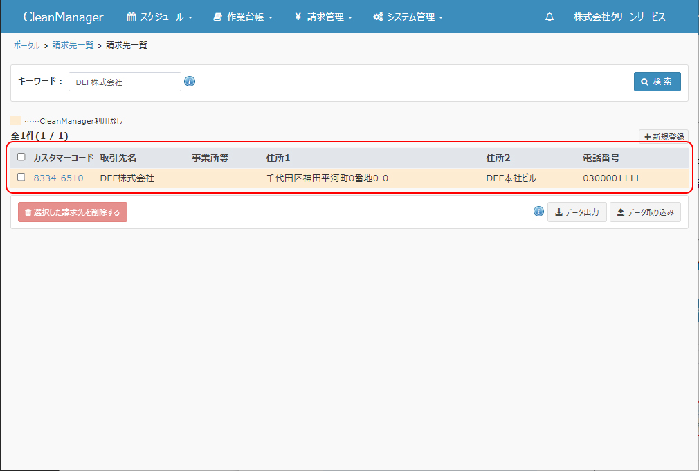 ② 請求先情報の請求先名や住所内に①で入力した文字列を含む請求先が一覧表示されます。