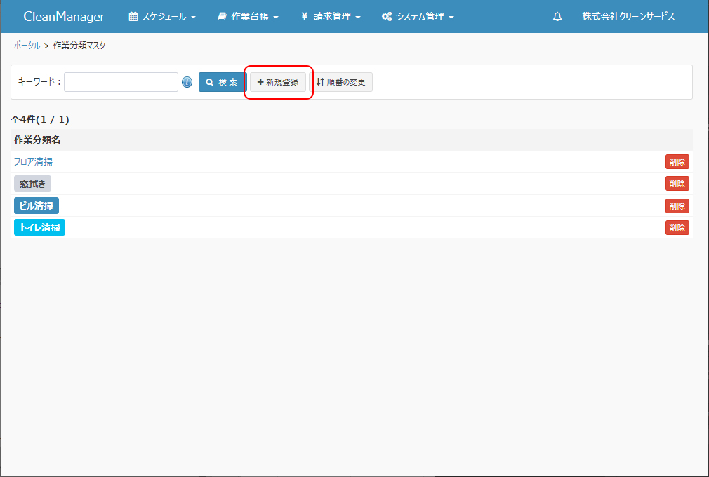 作業分類マスタを新規登録します。 ①作業分類マスタ画面にて「新規登録」ボタンをクリックします。 |