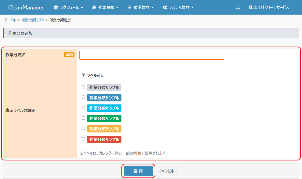 ②作業分類追加画面が表示されます。各項目に入力し、「登録」ボタンをクリックします。 | |