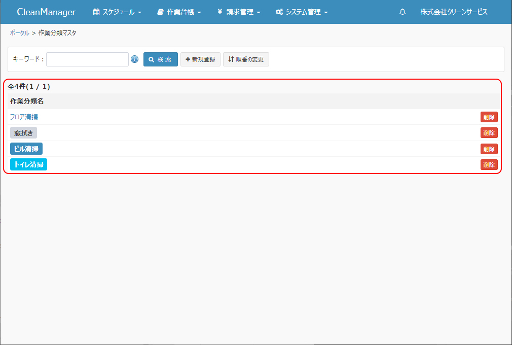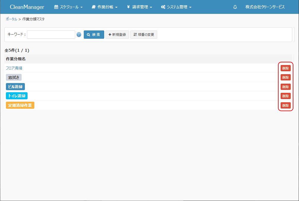 ①作業分類マスタ画面にて削除したい作業分類マスタ行の「削除」ボタンをクリックしてください。