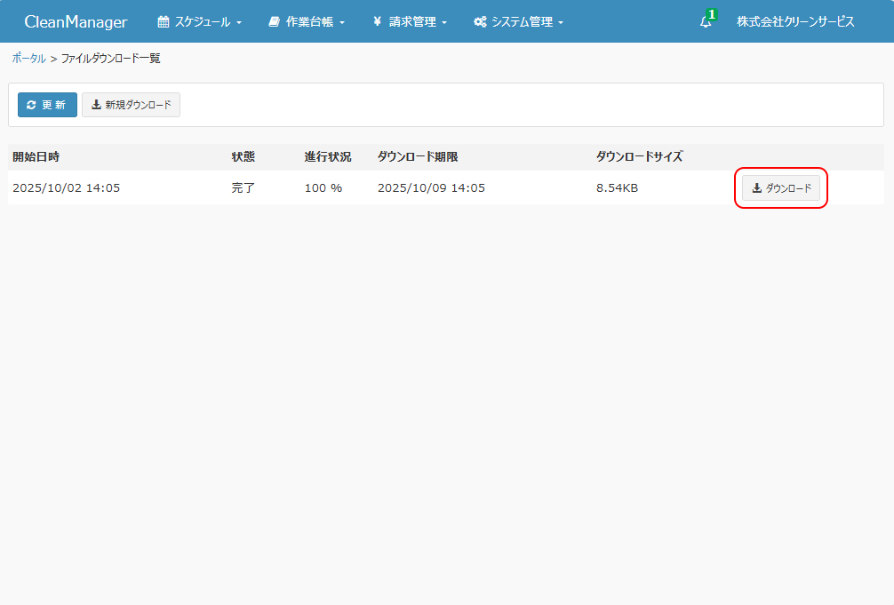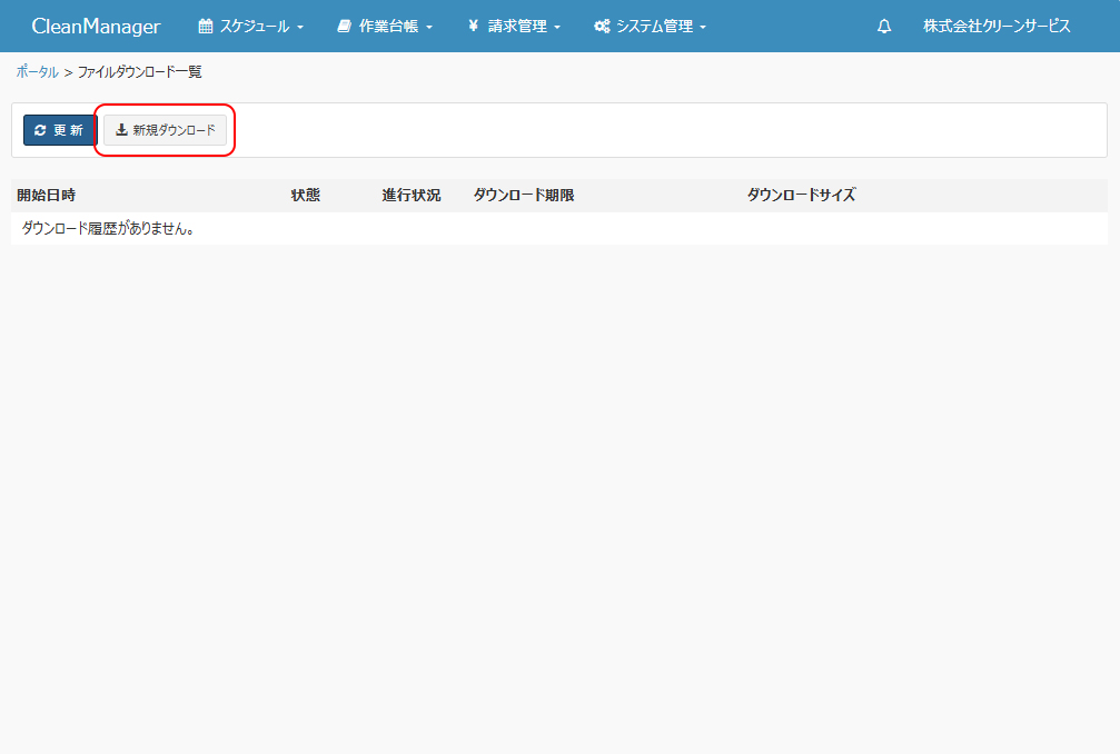 ②ファイルダウンロード一覧画面が表示されます。「新規ダウンロード」ボタンをクリックします。 | ||