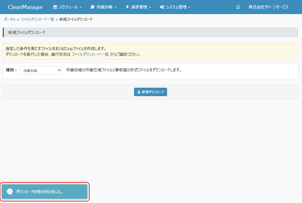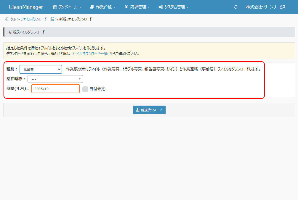作業写真などの添付ファイルを一括でダウンロードします。 ①ヘッダーメニューより「システム管理」→「ファイルダウンロード」を選択します。 |