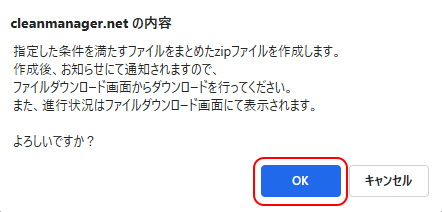 ⑥ダウンロードデータ準備完了後、ファイルダウンロード一覧画面にて「ダウンロード」ボタンをクリックするとファイルがダウンロードされます。 ※ダウンロードされたファイルは通常「C:\Users\ユーザー名\Download」に保存されます。 ※ブラウザの種類によってダウンロードする際の動作が異なります。詳しくはブラウザのヘルプ等をご参照ください。 ※一部のファイルのダウンロード準備に失敗した場合、状態は「失敗」となりますが「ダウンロード」ボタンが表示されていれば残りのファイルをダウンロードすることができます。 |
