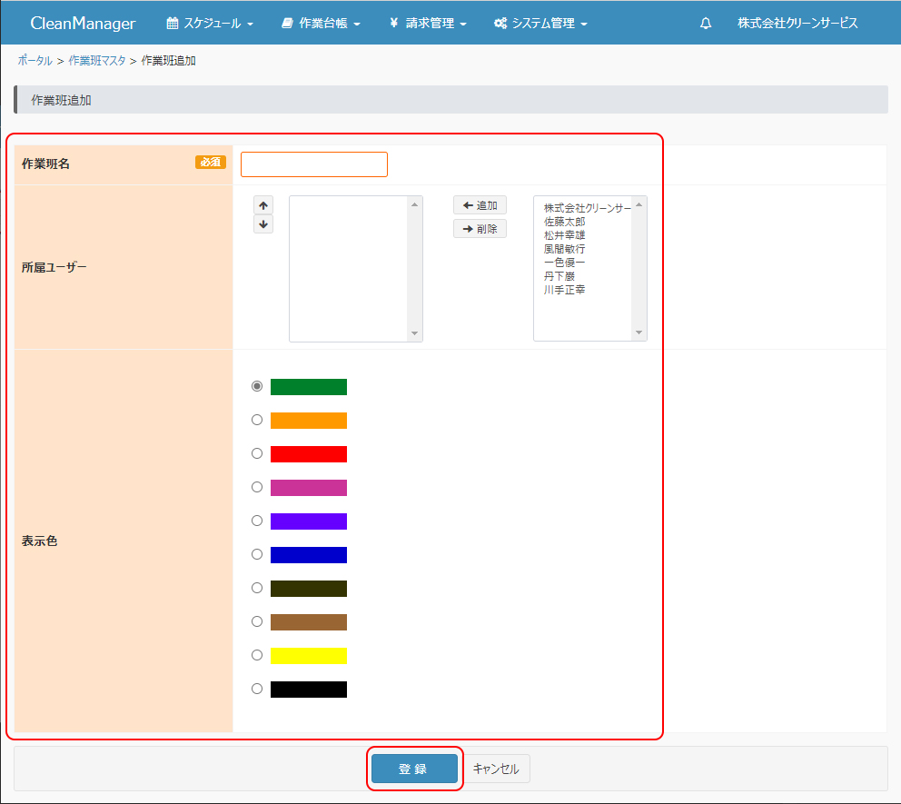 ②作業班追加画面が表示されます。各項目に入力し、「登録」ボタンをクリックします。
