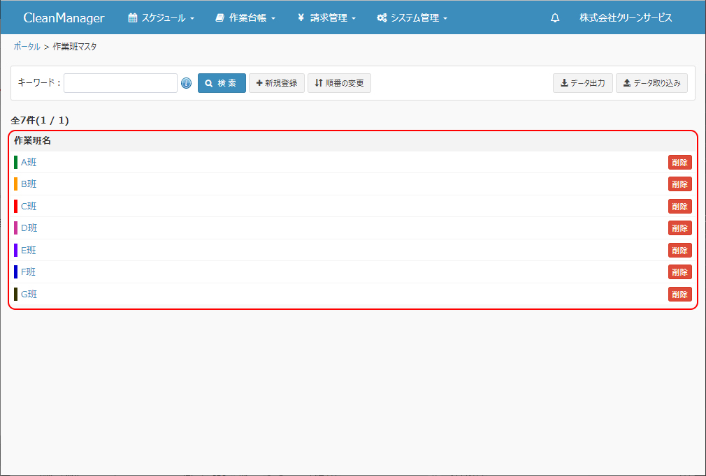 ③作業班マスタ画面に戻ります。これで、作業班が登録されました。登録された作業班が表示されていることをご確認ください。 |