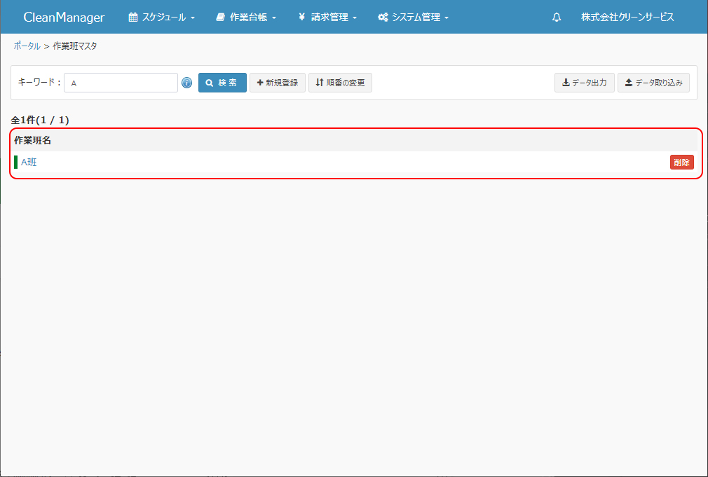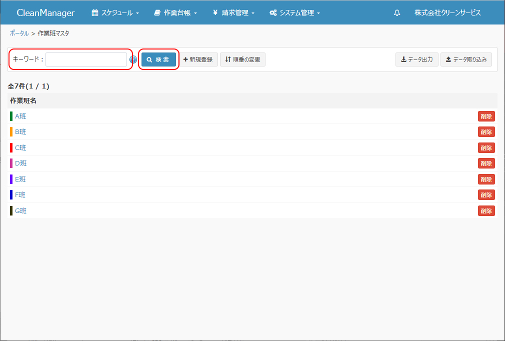 ①作業班マスタ画面にて検索条件を指定して「検索」ボタンをクリックします。