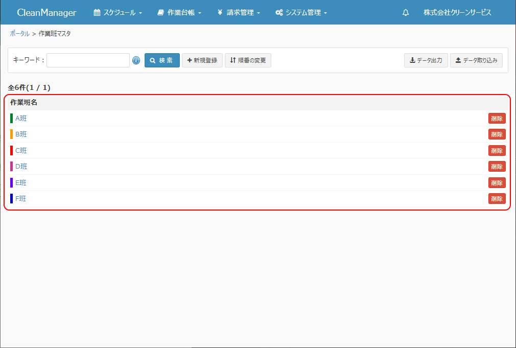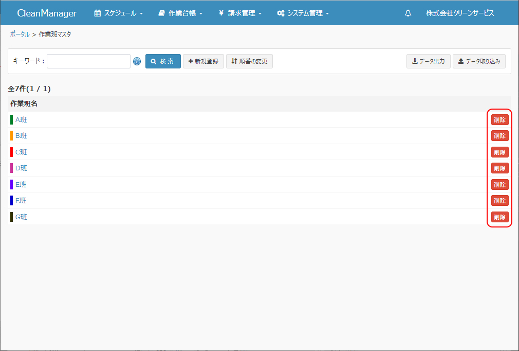 ①作業班マスタ画面にて削除したい作業班マスタ行の「削除」ボタンをクリックします。