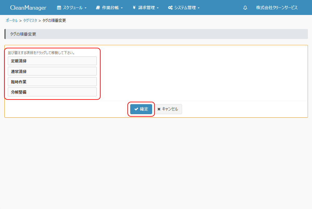 ②タグの順番変更画面が表示されます。並べ替えたいタグを任意の位置へドラッグして「確定」ボタンをクリックします。
