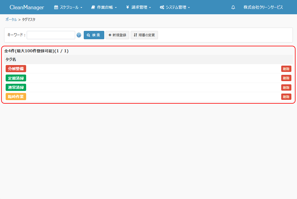 ③タグマスタ画面に戻ります。タグの表示順が②で並べ替えた順番に変更されました。