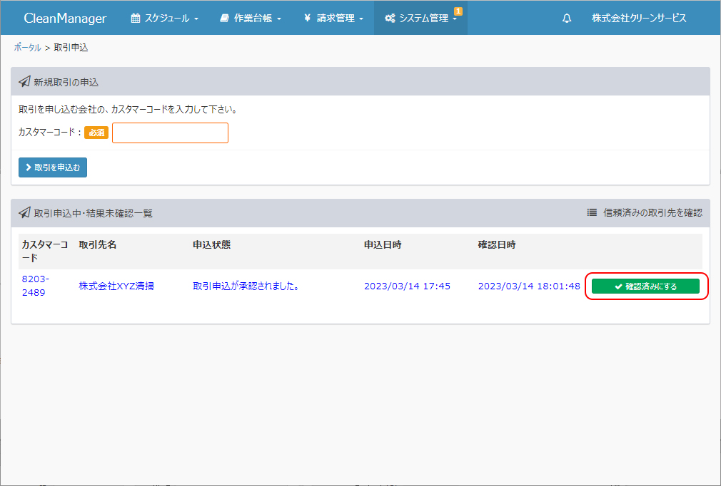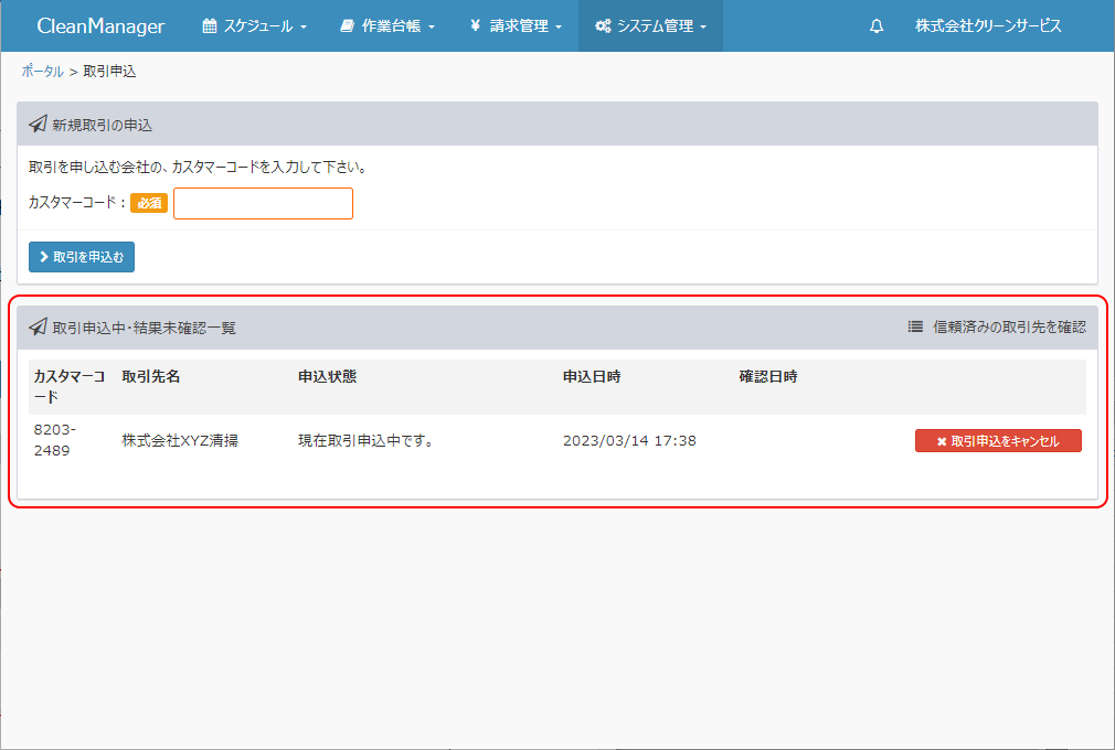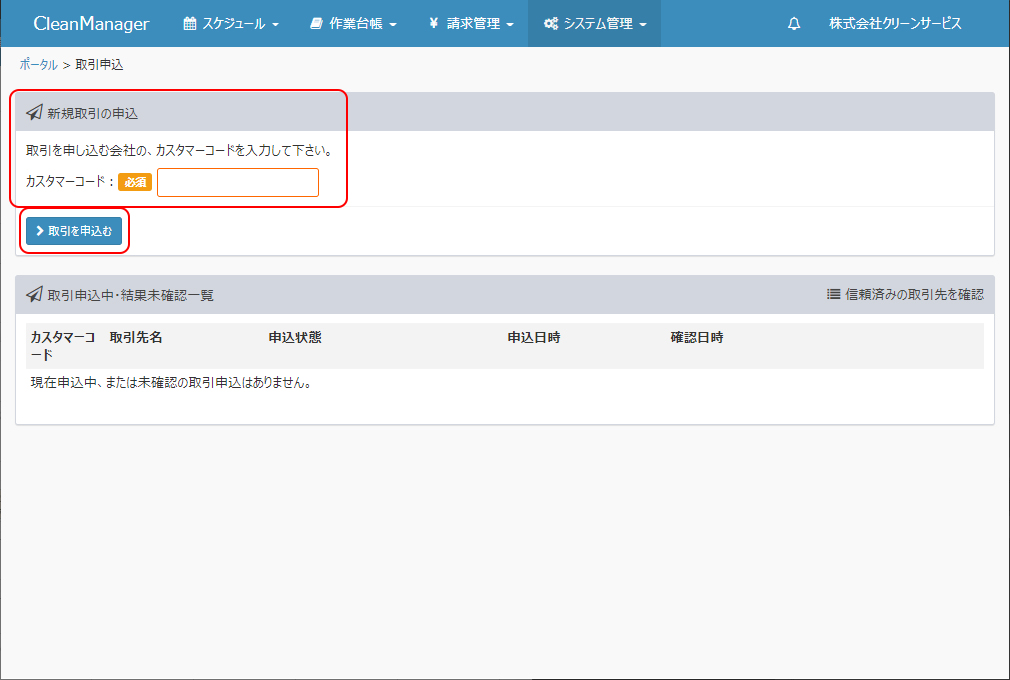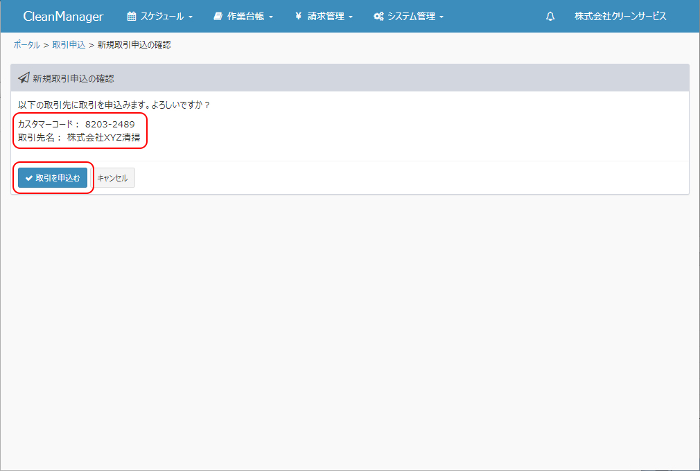 ② ①で入力したカスタマーコードと該当する取引先名が表示されます。よろしければ「取引を申込む」ボタンをクリックします。 | |