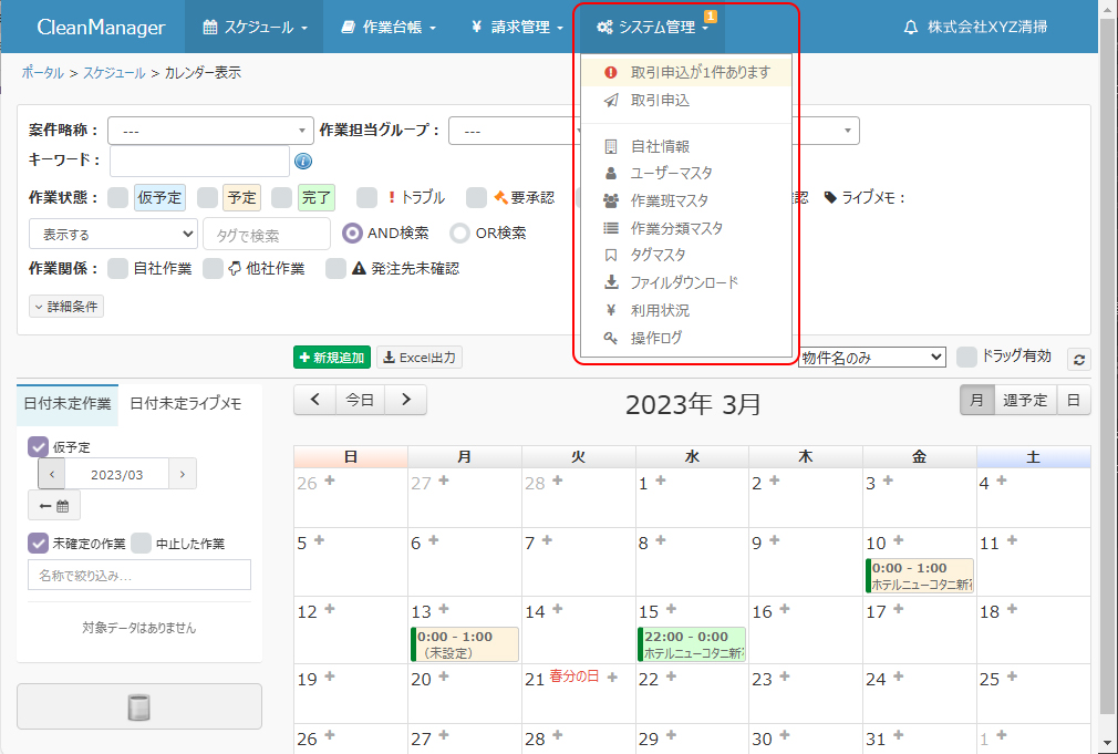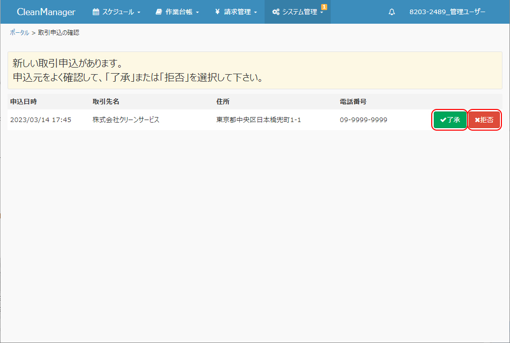 他社ユーザーから自社に対して申請された取引申込を了承、もしくは拒否するかを決定します。了承した場合、信頼関係が結ばれ相互に作業の発注先として指定することができるようになります。 ①他社ユーザーから取引申込を受けると、メニューの「システム管理」に新着件数が表示されます。「システム管理」→「取引申込が〇件あります」を選択します。 |