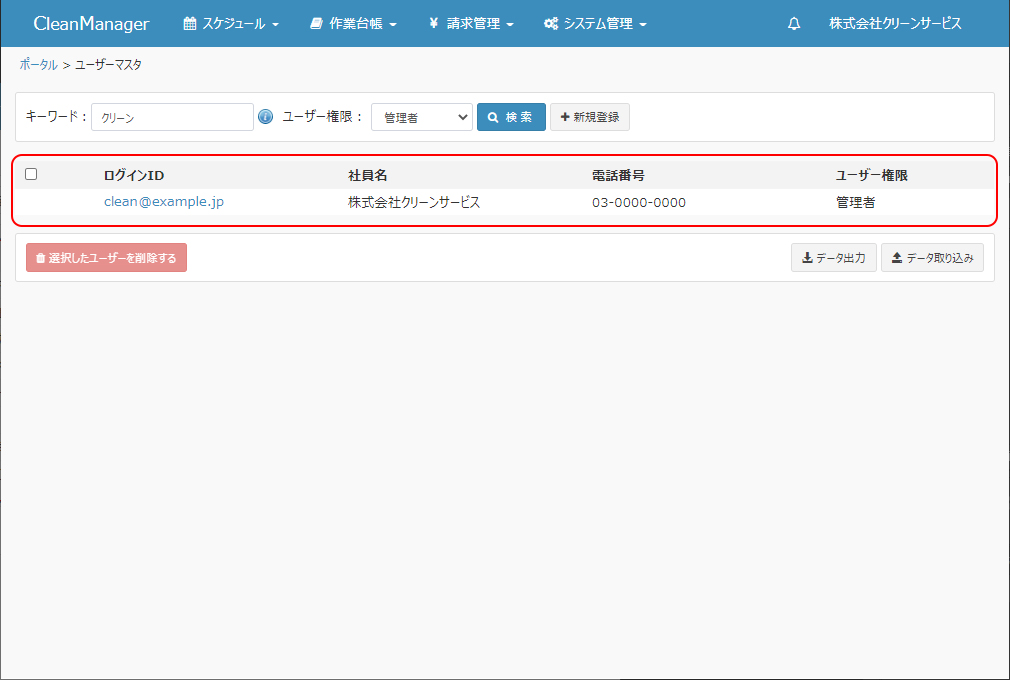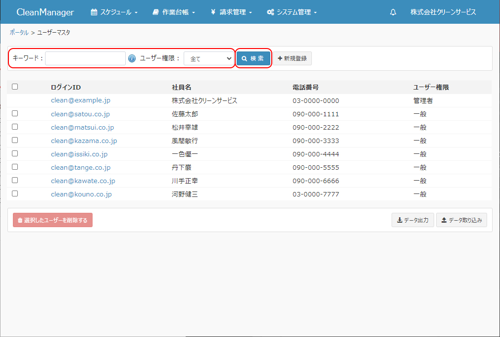 :ログインID、社員名に入力された文字列を含むユーザーが検索対象となります。