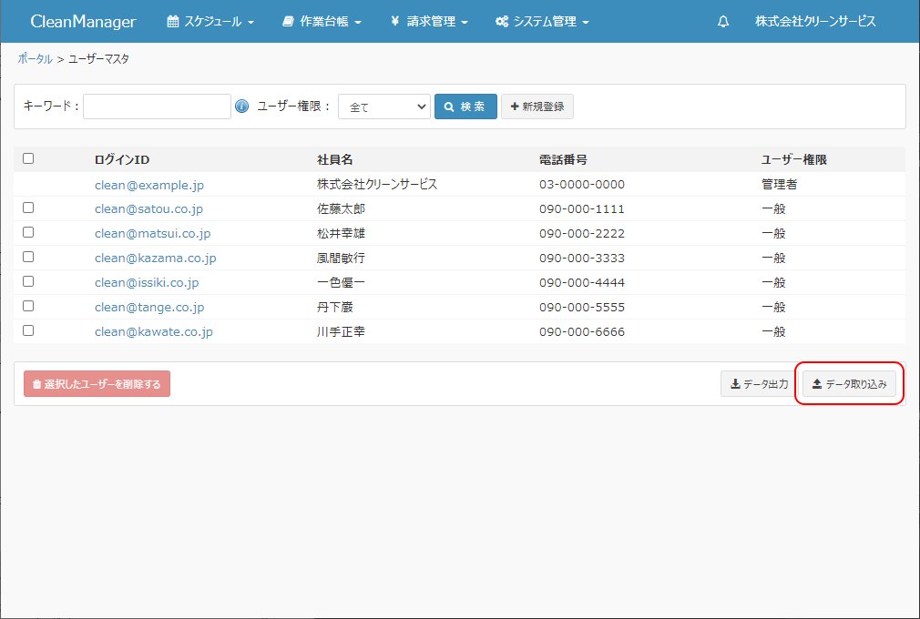 ②ユーザーマスタ画面にて「データ取り込み」ボタンをクリックします。 |