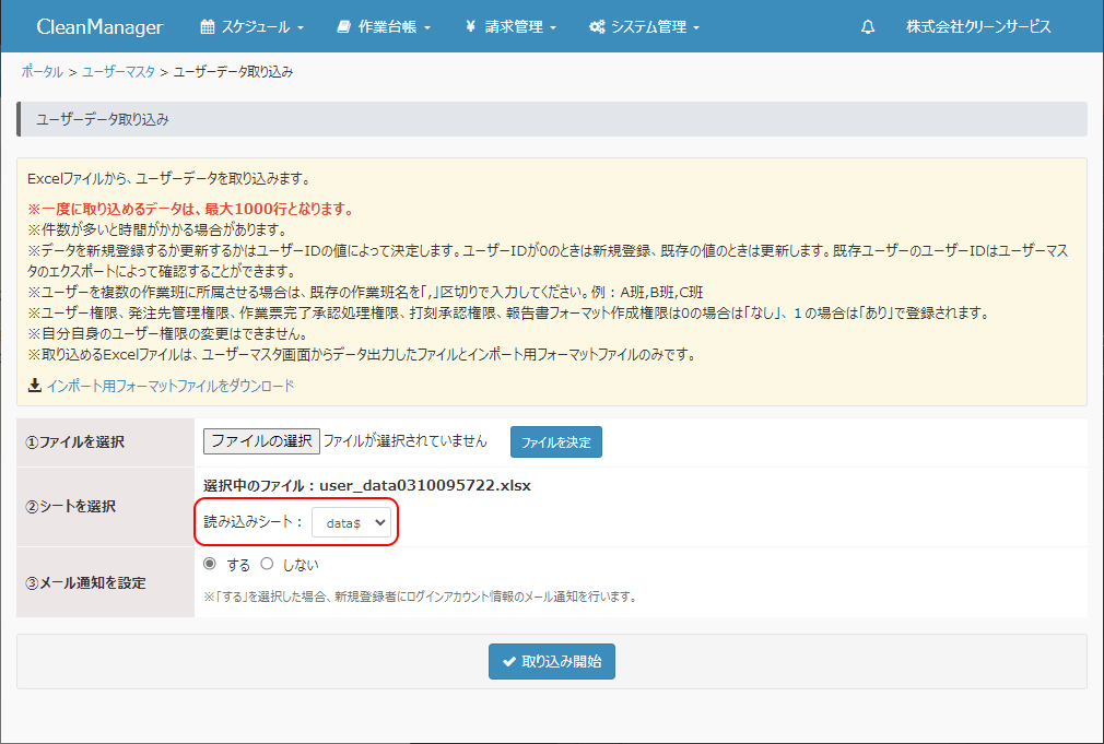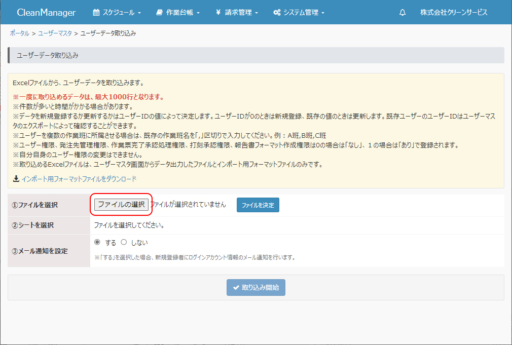 ※インポート用フォーマットファイルはユーザーマスタ画面にて「データ取り込み」ボタンをクリックしたのち遷移する画面にてダウンロードできます。