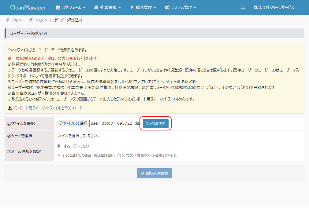 ※取り込めるExcelファイルは、ユーザーマスタ画面からデータ出力したファイルとインポート用フォーマットファイルのみです。→ユーザーマスタのデータ出力