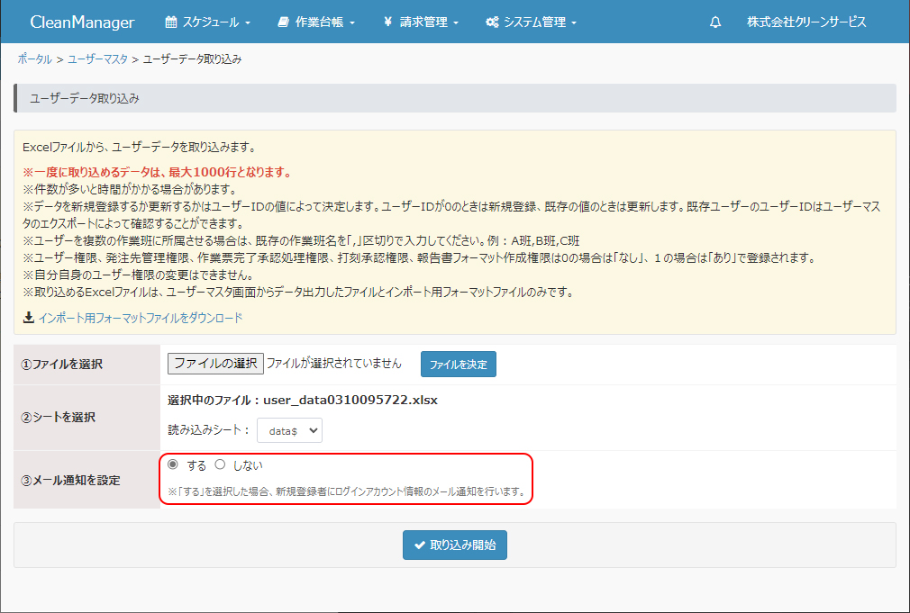 ⑥今回新規登録するユーザーに対するログインアカウント情報のメール通知について、する/しないのいずれかを選択し、「取り込み開始」ボタンをクリックします。 |