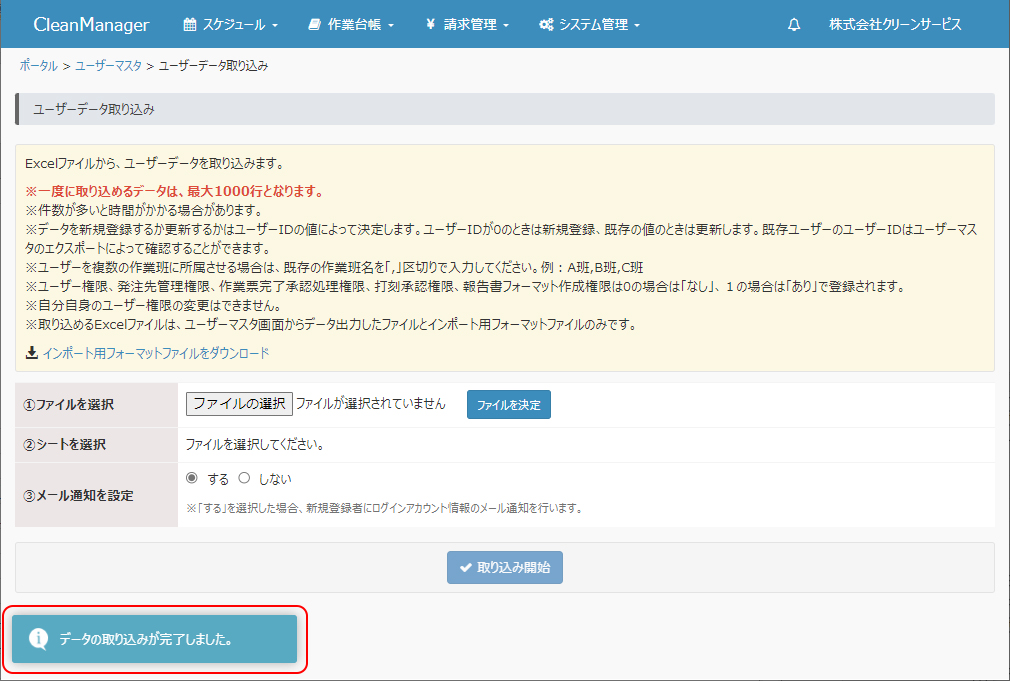 ⑦データの取り込み完了のメッセージが表示されます。これで、選択したExcelシート内のユーザーマスタのデータが一括登録されました。 |