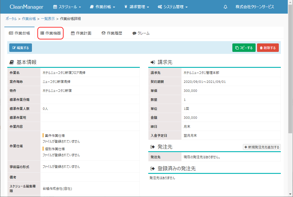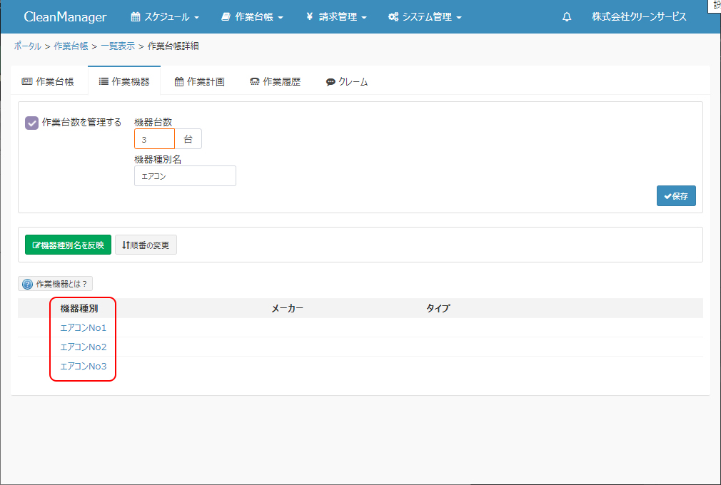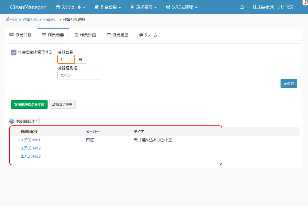 作業台帳にて管理している作業対象となる機器(エアコンや冷蔵庫など)の台数・機器種別等を確認します。また、個別の作業機器の詳細情報を登録することができます。