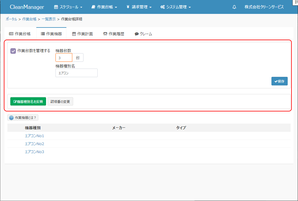 「□作業台数を管理する」からチェックを外した状態で「保存」ボタンをクリックすると、現在登録済みの機器台数 、機器種別名がすべて削除されます。