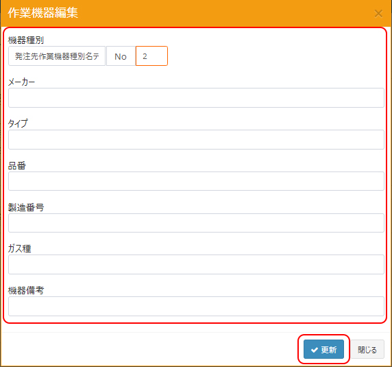 ⑤作業機器編集画面が表示されます。各項目に入力して「更新」ボタンをクリックします。 |