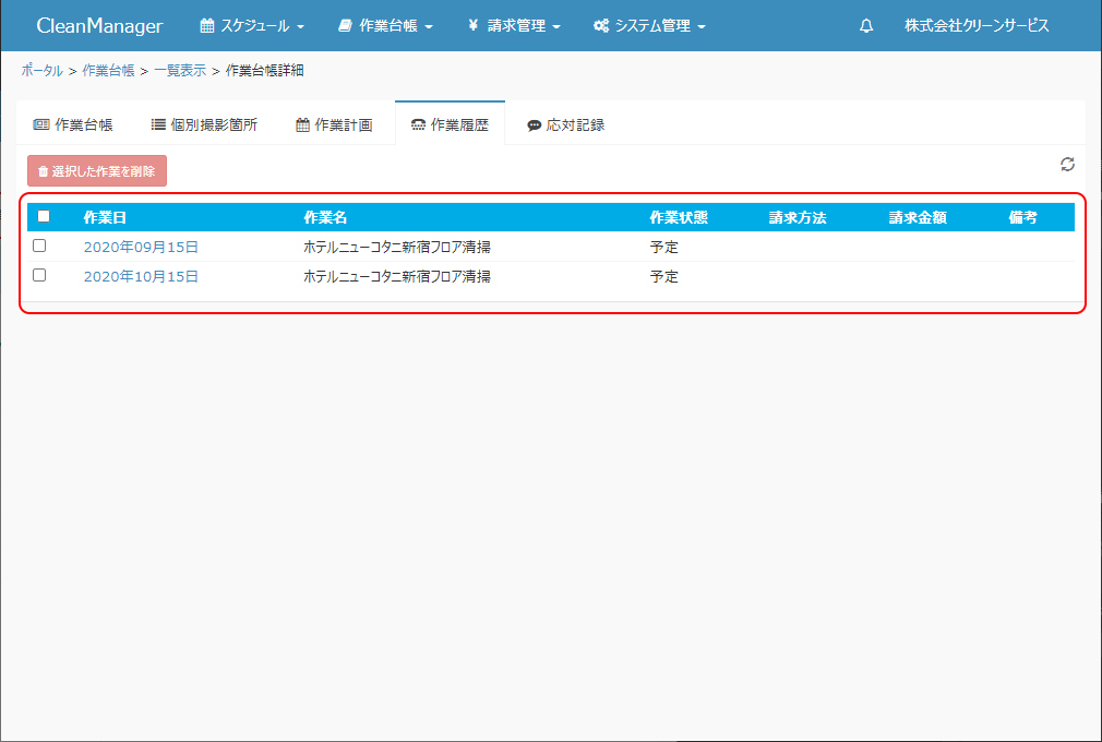 ③当該作業の作業履歴が一覧表示されます。
