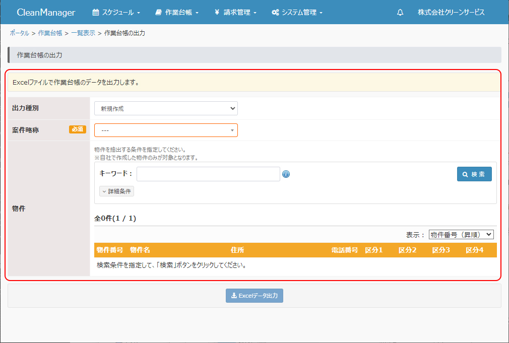 キーワード:任意の文字列を入力します。物件名、物件番号、住所1、住所2にここで入力した文字列を含む作業台帳が抽出されます。