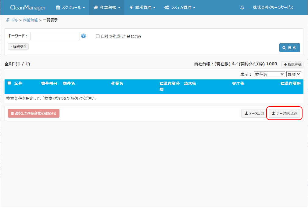 ②作業台帳一覧画面にて「データ取り込み」ボタンをクリックします。 |