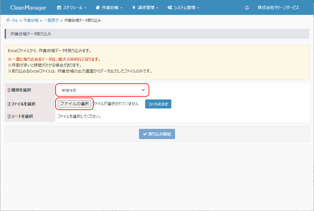 ※種別の選択時には作業台帳データの出力にて今回取り込むファイルを出力した際に選択した出力種別と同じ種別を選択してください。 |