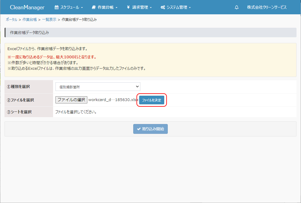 ※取り込めるExcelファイルは、作業台帳データの出力の手順にて出力したフォーマットのみです。 |