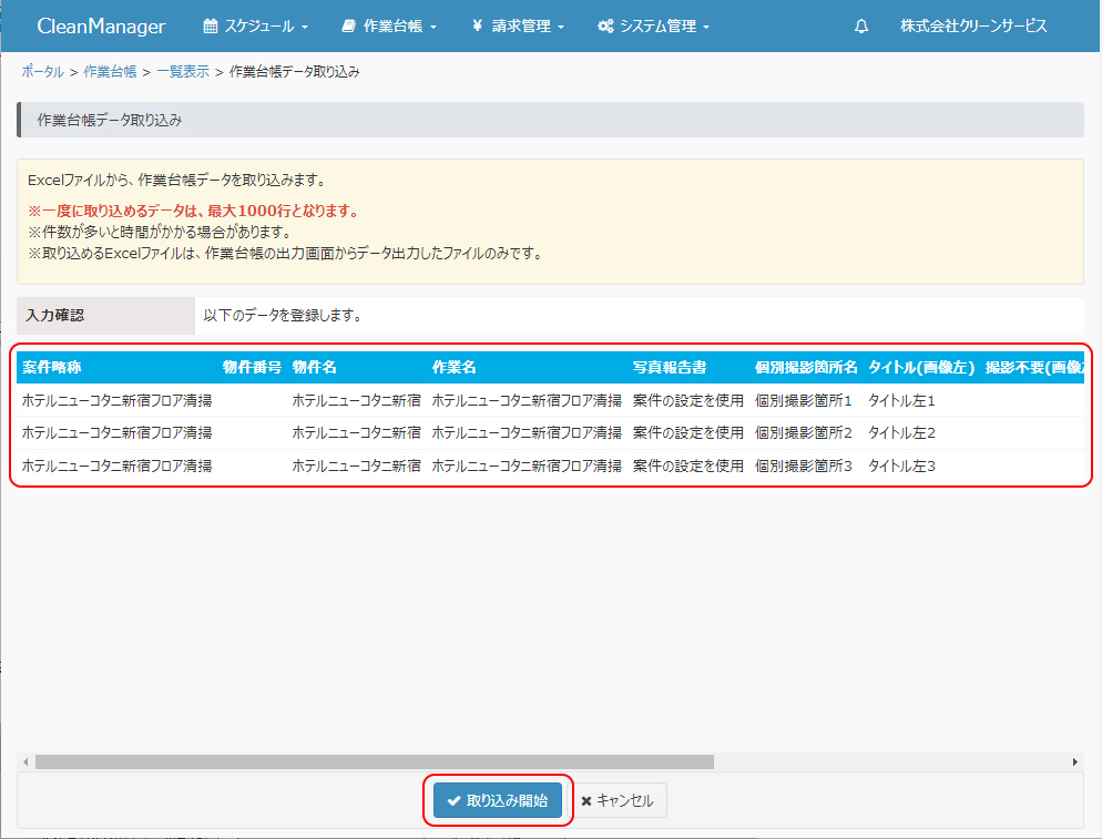 ⑥取り込んだファイルの中身がプレビューとして表示されます。データに問題が無いかを確認し、問題がなければ「取り込み開始」ボタンをクリックします。 |