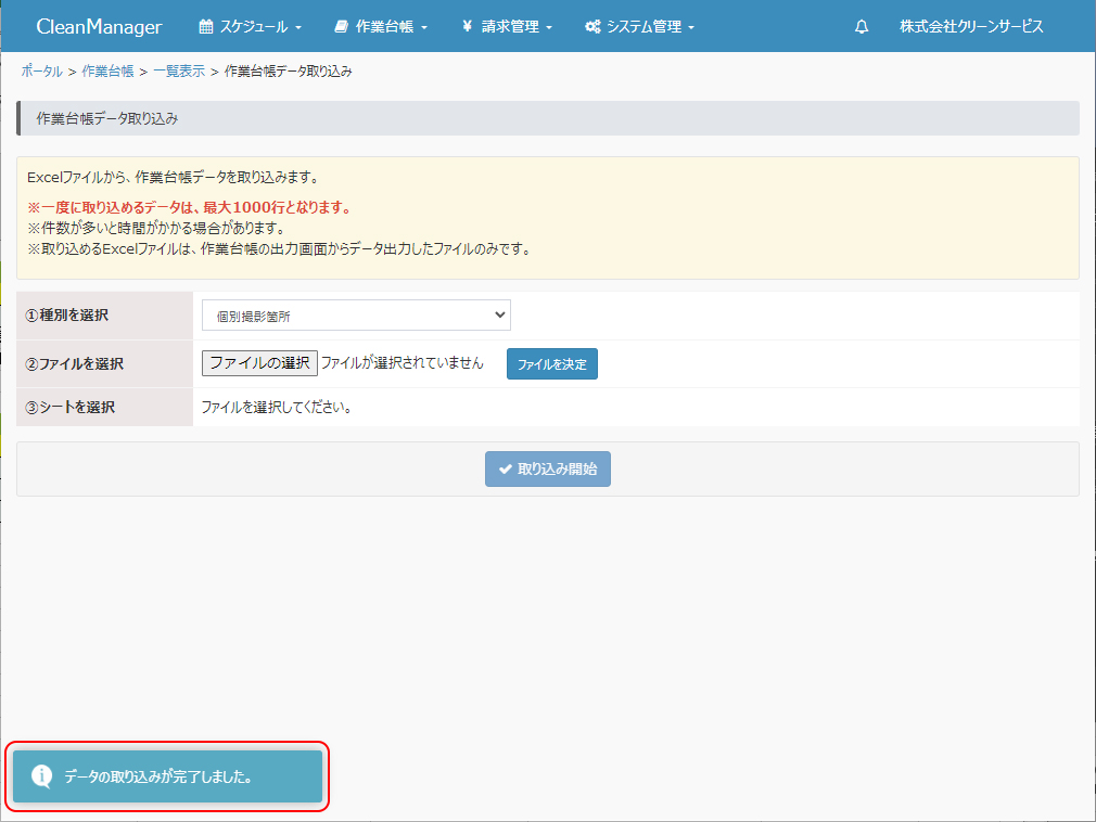 ⑥データの取り込み完了のメッセージが表示されます。これで、Excel内で指定された作業票の内容が一括登録されました。