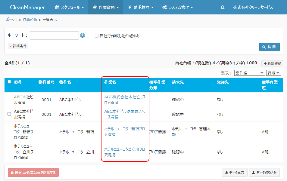 ①作業台帳の一覧画面にて、コピー元となる作業台帳の作業名をクリックします。 | |