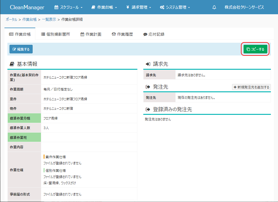 ②作業台帳詳細画面が表示されます。「コピーする」ボタンをクリックします。 | |